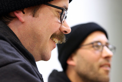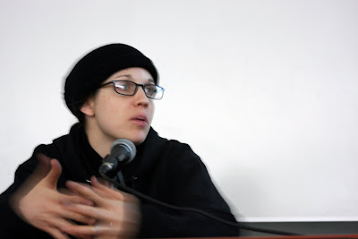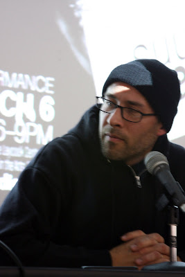 After the introduction, we kind of muttered self-consciously, then we started talking about our show. Very rapidly, it became obvious that each of us was channeling a different aspect of the Chris psyche, and each of us remained consistent to that throughout the performance. No one had planned who was going to say what, how each of us were going to act, or what each person would focus on, but everything worked seamlessly. Chris was rather confrontational (in a focused, inoffensive way), Chris was very obviously uncomfortable in front of so many people, Chris felt emboldened to explain his motivations to the audience, Chris helped keep the discussion to the outline Chris had written in a comfortable and self-deprecating way, and Chris liked to discuss underlying philosophies that had helped formulate and govern the project. Finally, at the end of the panel of Chrises, one of us discussed our social awkwardness, and everyone at the same time fell uncomfortably, awkwardly silent.